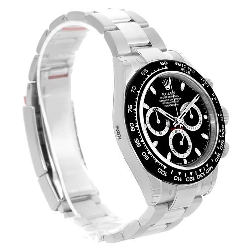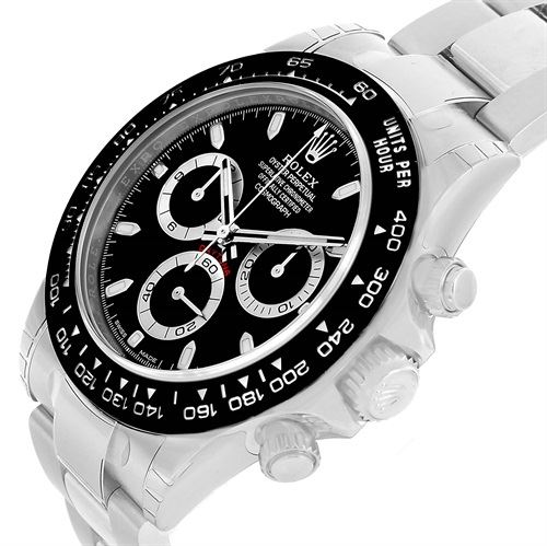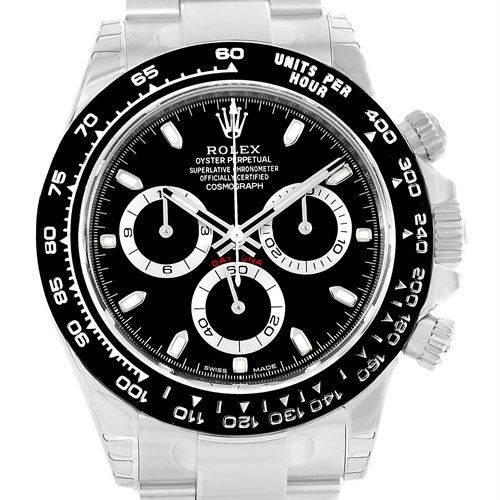 One Rolex Cosmograph Daytona Black Dial Chronograph Mens Watch 116500. The watch details are as follows: 40mm polished 904L stainless steel case, screw-down back and push buttons, screw-down crown and push buttons with Triplock triple waterproofness, black monobloc ceramic Cerachrom bezel with engraved tachymetric scale, scratch-resistant sapphire crystal, black lacquer dial, 18K white gold applied applique hour markers with Chroma-light, grey snailed counters, automatic movement with chronograph central second hand, 30-minute counter at 3 o'clock, and 12-hour counter at 9 o'clock, approximately 72 hours of power reserve, 904L stainless steel Oyster bracelet with solid links, folding Oyster lock buckle with Easylink 5mm comfort extension link. Waterproof to 100 meters.