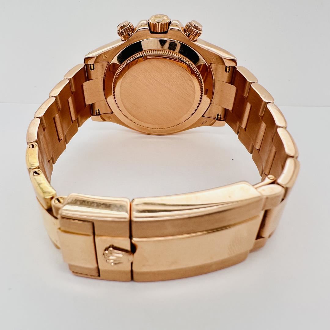 This Rolex Cosmograph Daytona is crafted in 18k Everose gold, Rolex's proprietary rose gold alloy. The watch features a matching rose dial with contrasting black subdials, tachymeter-engraved bezel, and the iconic Oyster bracelet. A legendary chronograph, the Daytona is celebrated for its racing heritage, precision performance, and striking design, making it one of Rolex's most sought-after models.