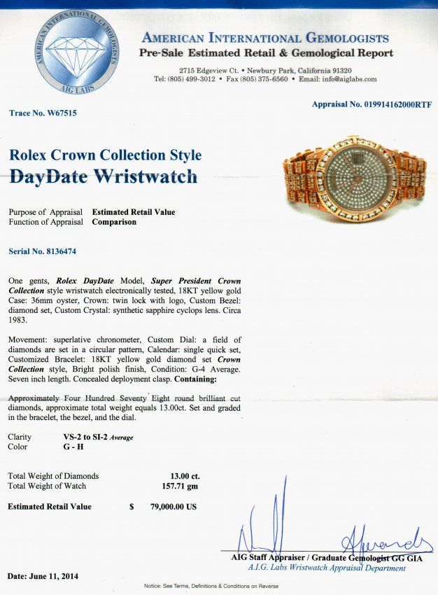 Regarding Appraised Jewelry and Loose Stones - Windsor Auction sends them out to a third party for Retail Replacement Value Appraisals, which are the most common. These types of evaluations are written for insurance needs. This would be the cost to replace the jewelry with an item of equal quality and kind, considered to be the current market price or the replacement value. This type of appraisal is done to protect you in the event of damage or loss of a valuable item. Our appraisals are conducted by independent 3rd Party appraisal firms that utilizes Certified GIA Gemologist. Appraisals should be used for verification of gemstone and/or metal weight, size, and grade only, not actual value. Appraisal value should be considered for insurance purposes only, not actual value, as price varies greatly from retail locations thru out the world. Items should not be purchased with the expectation to resell for appraisal price, or for profit.