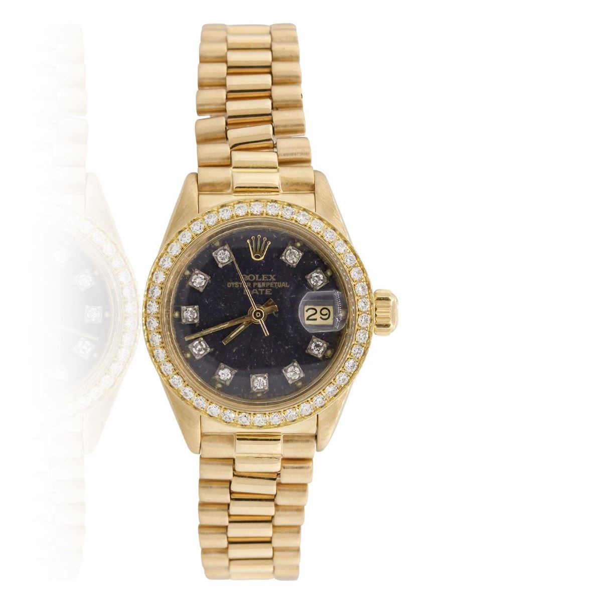 One ladies, hand crafted & machine milled Rolex Date model, wristwatch electronically tested 18KT yellow gold, Circa: 1977, Case: 25mm oyster, Crown: twinlock with logo, Custom Bezel: diamond set, Custom Crystal: synthetic sapphire cyclops lens. Movement: automatic, Custom Dial: Black, baton style hands, with diamond markers, Date Display: 3 o'clock position, non-quick set, Bracelet: 18KT yellow gold, Bright polish and satin finish, Condition: G-4 Average. Six and one half inch length. Concealed clasp, with logo. Containing: Forty Two round brilliant cut diamonds, measuring an average of 1.50mm in diameter, approximate. Total Weight of 42 Stones = 0.52ct. Set and graded in the bezel. Clarity VS-2 to SI-1. Color: F - HTotal Weight of Diamonds 0.52ct. Total Weight of Watch 66.33 grams. AIG Appraised at $18,550.00.