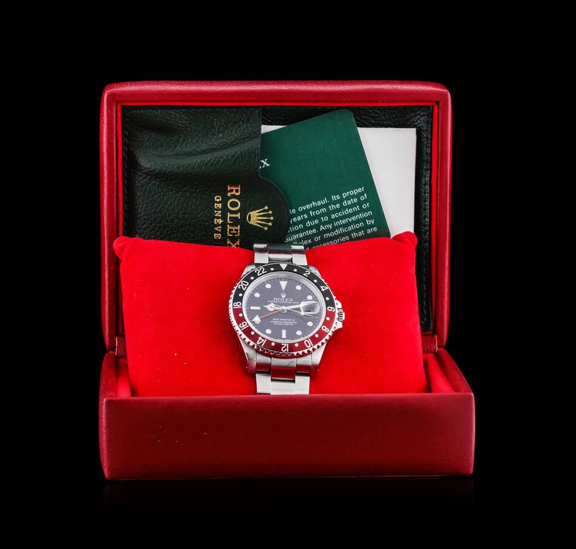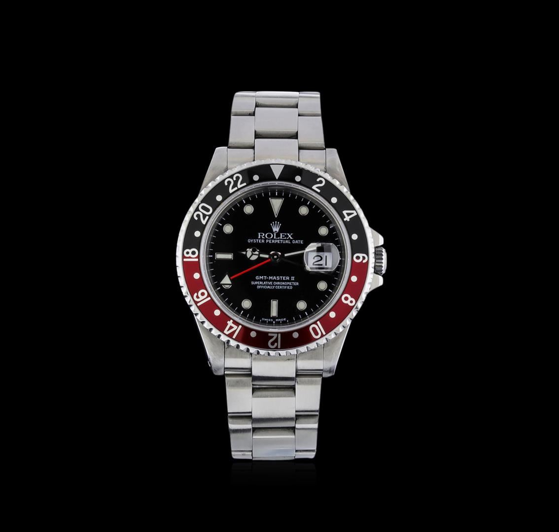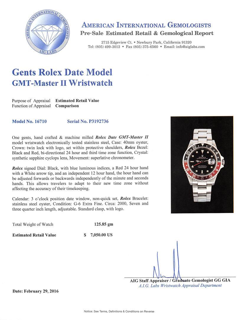 One gents, hand crafted & machine milled Rolex Date GMT-Master II model wristwatch electronically tested stainless steel, Case: 40mm oyster, Crown: twin lock with logo, set within protective shoulders, Rolex Bezel: Black and Red, bi-directional 24 hour and third time zone function, Crystal: synthetic sapphire cyclops lens, Movement: superlative chronometer. Rolex signed Dial: Black, with blue luminous indices, a Red 24 hour hand with a White arrow tip, and an independent 12 hour hand, the hour hand can be adjusted forwards or backwards independently of the minute and seconds hands. This allows travelers to adapt to their new time zone without affecting the accuracy of their timekeeping. Calendar: 3 o'clock position date window, non-quick set, Rolex Bracelet: stainless steel oyster, Condition: G-6 Extra Fine. Circa: 2000, Seven and three quarter inch length, adjustable. Standard clasp, with logo. Total Weight of Watch 125.85gm. AIG Appraised at $7,050.00.