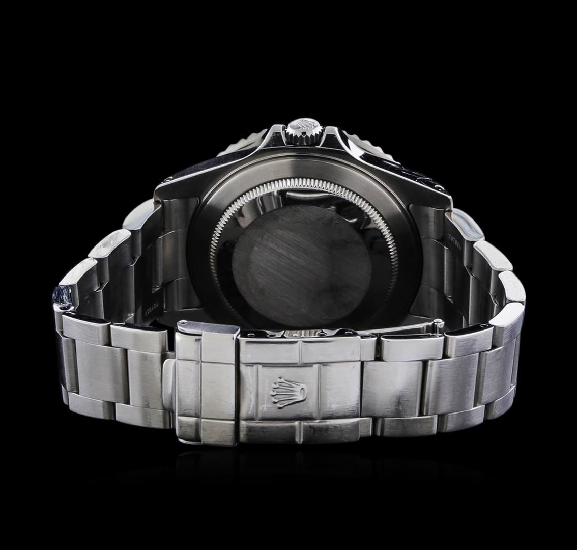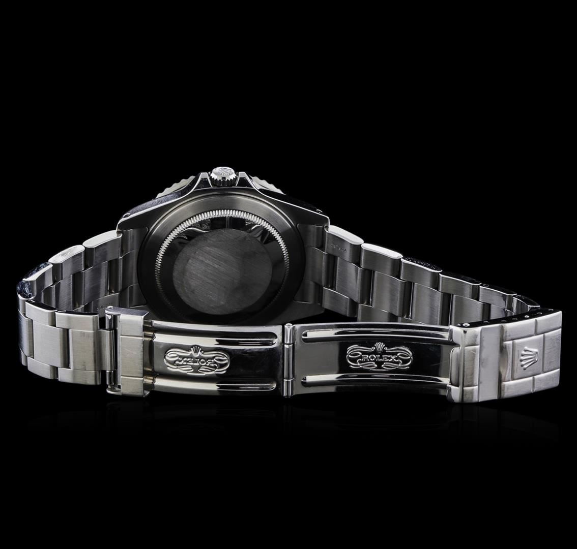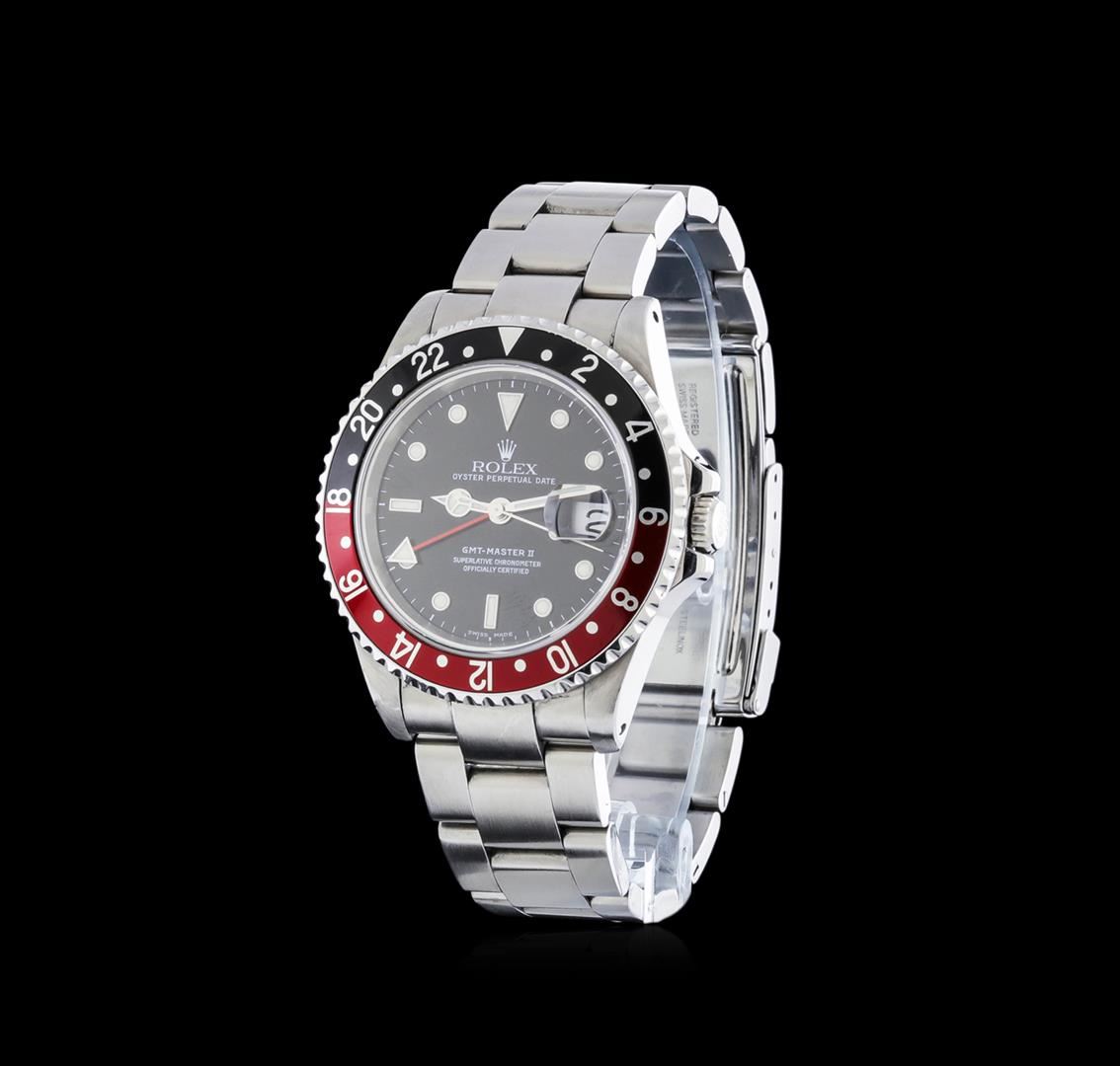 One gents, hand crafted & machine milled Rolex Date GMT-Master II model wristwatch electronically tested stainless steel, Case: 40mm oyster, Crown: twin lock with logo, set within protective shoulders, Rolex Bezel: Black and Red, bi-directional 24 hour and third time zone function, Crystal: synthetic sapphire cyclops lens, Movement: superlative chronometer. Rolex signed Dial: Black, with blue luminous indices, a Red 24 hour hand with a White arrow tip, and an independent 12 hour hand, the hour hand can be adjusted forwards or backwards independently of the minute and seconds hands. This allows travelers to adapt to their new time zone without affecting the accuracy of their timekeeping. Calendar: 3 o'clock position date window, non-quick set, Rolex Bracelet: stainless steel oyster, Condition: G-6 Extra Fine. Circa: 2000, Seven and three quarter inch length, adjustable. Standard clasp, with logo. Total Weight of Watch 125.85gm. AIG Appraised at $7,050.00.