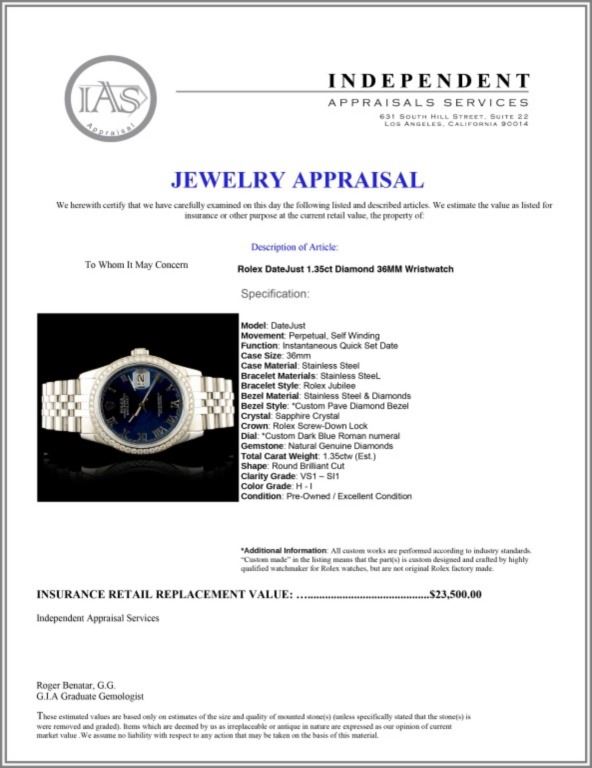Regarding Appraised Jewelry and Loose Stones - Auctionfarm sends them out to a third party for Retail Replacement Value Appraisals, which are the most common. These types of evaluations are written for insurance needs. This would be the cost to replace the jewelry with an item of equal quality and kind, considered to be the current market price or the replacement value. This type of appraisal is done to protect you in the event of damage or loss of a valuable item. Our appraisals are conducted by independent 3rd Party appraisal firms that utilizes Certified GIA Gemologist. Appraisals should be used for verification of gemstone and/or metal weight, size, and grade only, not actual value. Appraisal value should be considered for insurance purposes only, not actual value, as price varies greatly from retail locations thru out the world. Items should not be purchased with the expectation to resell for appraisal price, or for profit.