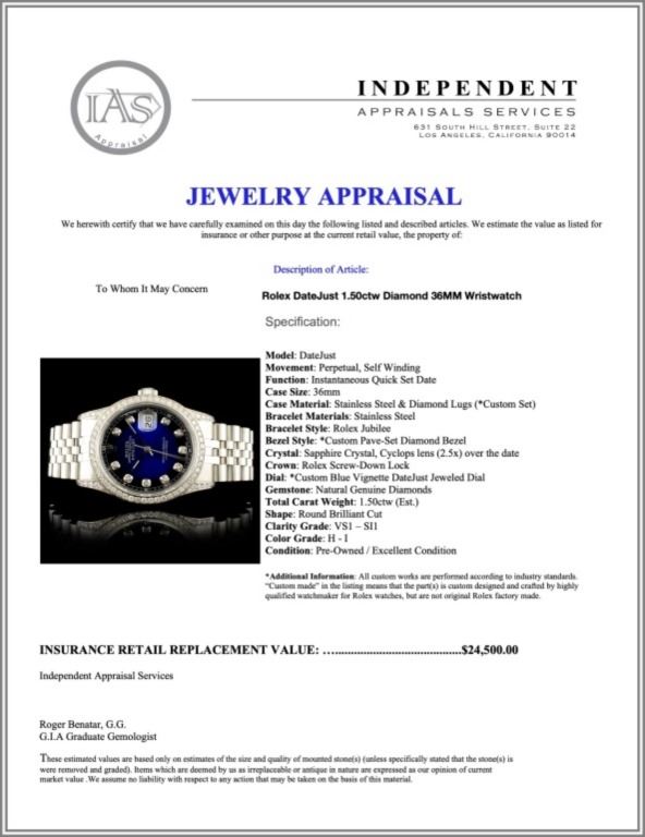 Regarding Appraised Jewelry and Loose Stones - Auctionfarm sends them out to a third party for Retail Replacement Value Appraisals, which are the most common. These types of evaluations are written for insurance needs. This would be the cost to replace the jewelry with an item of equal quality and kind, considered to be the current market price or the replacement value. This type of appraisal is done to protect you in the event of damage or loss of a valuable item. Our appraisals are conducted by independent 3rd Party appraisal firms that utilizes Certified GIA Gemologist. Appraisals should be used for verification of gemstone and/or metal weight, size, and grade only, not actual value. Appraisal value should be considered for insurance purposes only, not actual value, as price varies greatly from retail locations thru out the world. Items should not be purchased with the expectation to resell for appraisal price, or for profit.