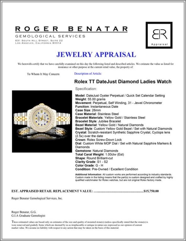 Dial: Custom White MOP Dial / Set with Natural Sapphire Markers & Diamonds