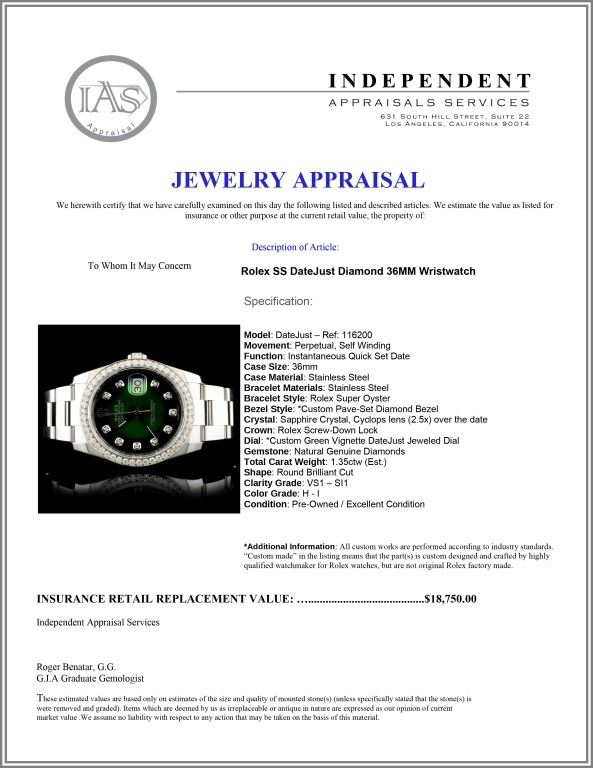 Dial: *Custom Green Vignette DateJust Jeweled Dial