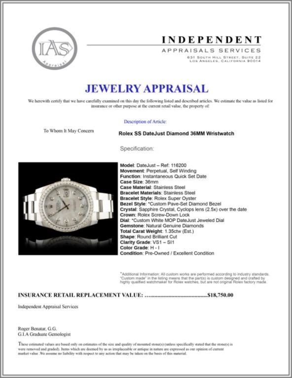 Rolex DateJust 116200 SS 1.35ct Diamond 36MM Watch