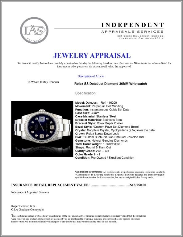 Dial: *Custom Sunburst Blue DateJust Jeweled Dial