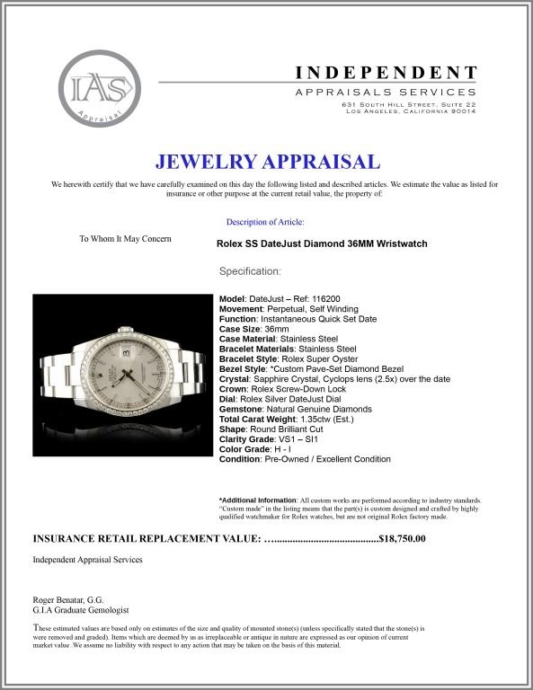 Regarding Appraised Jewelry and Loose Stones - Auctionfarm sends them out to a third party for Retail Replacement Value Appraisals, which are the most common. These types of evaluations are written for insurance needs. This would be the cost to replace the jewelry with an item of equal quality and kind, considered to be the current market price or the replacement value. This type of appraisal is done to protect you in the event of damage or loss of a valuable item. Our appraisals are conducted by independent 3rd Party appraisal firms that utilizes Certified GIA Gemologist. Appraisals should be used for verification of gemstone and/or metal weight, size, and grade only, not actual value. Appraisal value should be considered for insurance purposes only, not actual value, as price varies greatly from retail locations thru out the world. Items should not be purchased with the expectation to resell for appraisal price, or for profit.