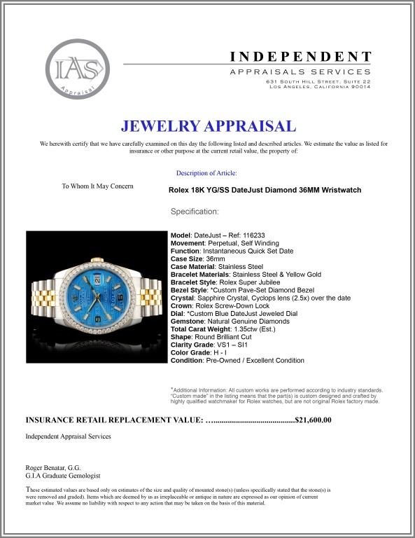 Regarding Appraised Jewelry and Loose Stones - Auctionfarm sends them out to a third party for Retail Replacement Value Appraisals, which are the most common. These types of evaluations are written for insurance needs. This would be the cost to replace the jewelry with an item of equal quality and kind, considered to be the current market price or the replacement value. This type of appraisal is done to protect you in the event of damage or loss of a valuable item. Our appraisals are conducted by independent 3rd Party appraisal firms that utilizes Certified GIA Gemologist. Appraisals should be used for verification of gemstone and/or metal weight, size, and grade only, not actual value. Appraisal value should be considered for insurance purposes only, not actual value, as price varies greatly from retail locations thru out the world. Items should not be purchased with the expectation to resell for appraisal price, or for profit.