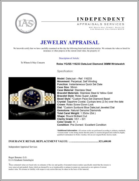 Dial: *Custom Sunburst Blue DateJust Jeweled Dial