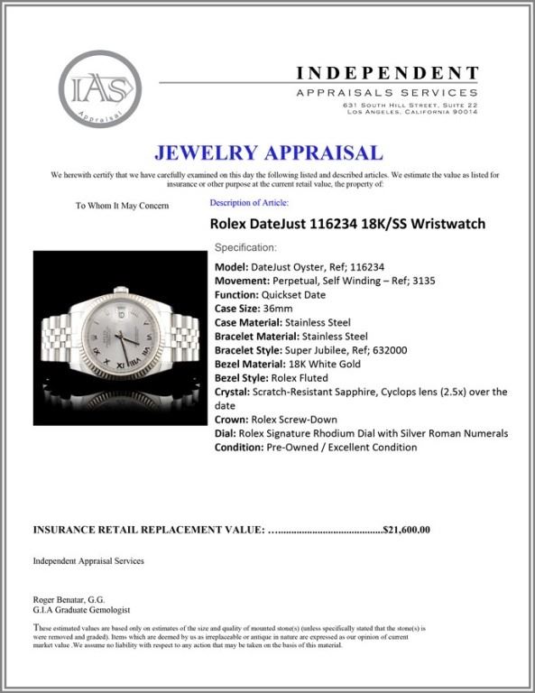 Dial: Rolex Signature Rhodium Dial with Silver Roman Numerals