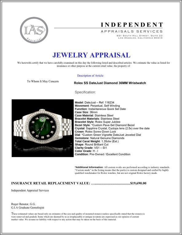 Dial: *Custom Green Vignette DateJust Jeweled Dial