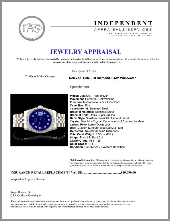 Regarding Appraised Jewelry and Loose Stones - Auctionfarm sends them out to a third party for Retail Replacement Value Appraisals, which are the most common. These types of evaluations are written for insurance needs. This would be the cost to replace the jewelry with an item of equal quality and kind, considered to be the current market price or the replacement value. This type of appraisal is done to protect you in the event of damage or loss of a valuable item. Our appraisals are conducted by independent 3rd Party appraisal firms that utilizes Certified GIA Gemologist. Appraisals should be used for verification of gemstone and/or metal weight, size, and grade only, not actual value. Appraisal value should be considered for insurance purposes only, not actual value, as price varies greatly from retail locations thru out the world. Items should not be purchased with the expectation to resell for appraisal price, or for profit.
