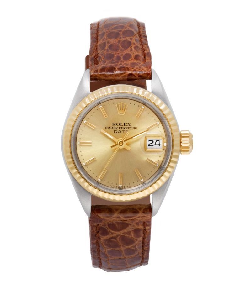 One Rolex Date Just 14KT Gold and Stainless Steel Ladies Wristwatch. Ladies Rolex Date in 14KT & stainless steel on brown crocodile strap. Automatic with sweep seconds and date. Model 6917. Circa 1969. Fine Pre-owned Rolex Watch. Case is 26mm by 26mm.