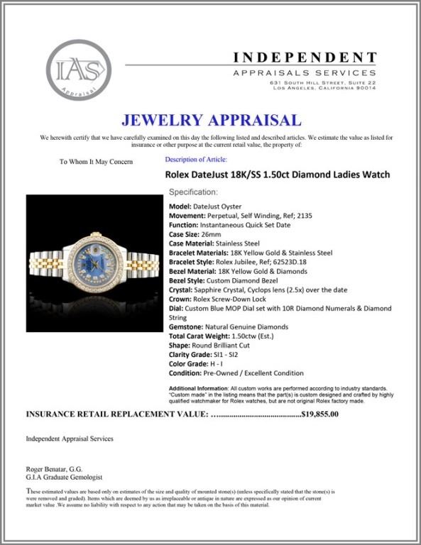 Dial: Custom Blue MOP Dial set with 10R Diamond Numerals & Diamond String