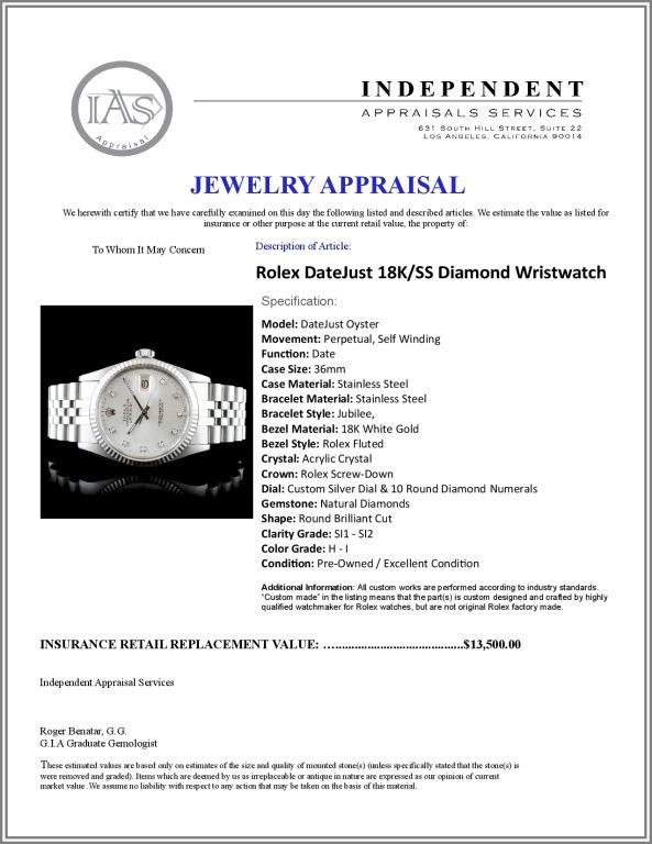 Dial: Custom Silver Dial & 10 Round Diamond Numerals