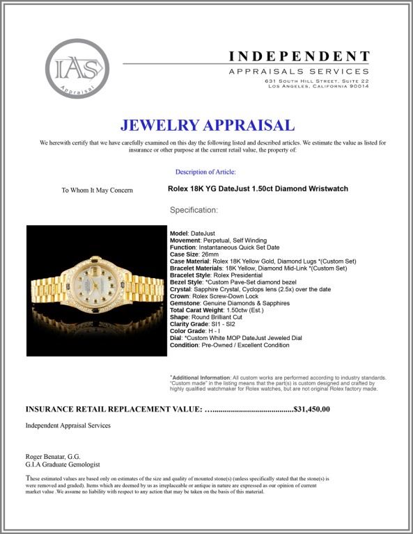 Regarding Appraised Jewelry and Loose Stones - Auctionfarm sends them out to a third party for Retail Replacement Value Appraisals, which are the most common. These types of evaluations are written for insurance needs. This would be the cost to replace the jewelry with an item of equal quality and kind, considered to be the current market price or the replacement value. This type of appraisal is done to protect you in the event of damage or loss of a valuable item. Our appraisals are conducted by independent 3rd Party appraisal firms that utilizes Certified GIA Gemologist. Appraisals should be used for verification of gemstone and/or metal weight, size, and grade only, not actual value. Appraisal value should be considered for insurance purposes only, not actual value, as price varies greatly from retail locations thru out the world. Items should not be purchased with the expectation to resell for appraisal price, or for profit.