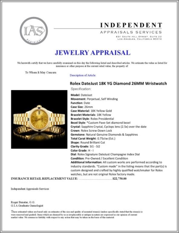 Regarding Appraised Jewelry and Loose Stones - Auctionfarm sends them out to a third party for Retail Replacement Value Appraisals, which are the most common. These types of evaluations are written for insurance needs. This would be the cost to replace the jewelry with an item of equal quality and kind, considered to be the current market price or the replacement value. This type of appraisal is done to protect you in the event of damage or loss of a valuable item. Our appraisals are conducted by independent 3rd Party appraisal firms that utilizes Certified GIA Gemologist. Appraisals should be used for verification of gemstone and/or metal weight, size, and grade only, not actual value. Appraisal value should be considered for insurance purposes only, not actual value, as price varies greatly from retail locations thru out the world. Items should not be purchased with the expectation to resell for appraisal price, or for profit.