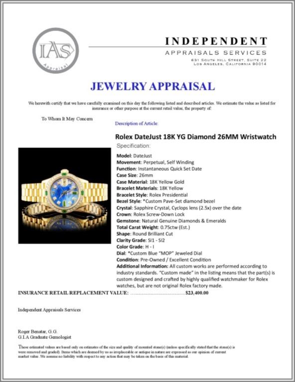 Regarding Appraised Jewelry and Loose Stones - Auctionfarm sends them out to a third party for Retail Replacement Value Appraisals, which are the most common. These types of evaluations are written for insurance needs. This would be the cost to replace the jewelry with an item of equal quality and kind, considered to be the current market price or the replacement value. This type of appraisal is done to protect you in the event of damage or loss of a valuable item. Our appraisals are conducted by independent 3rd Party appraisal firms that utilizes Certified GIA Gemologist. Appraisals should be used for verification of gemstone and/or metal weight, size, and grade only, not actual value. Appraisal value should be considered for insurance purposes only, not actual value, as price varies greatly from retail locations thru out the world. Items should not be purchased with the expectation to resell for appraisal price, or for profit.