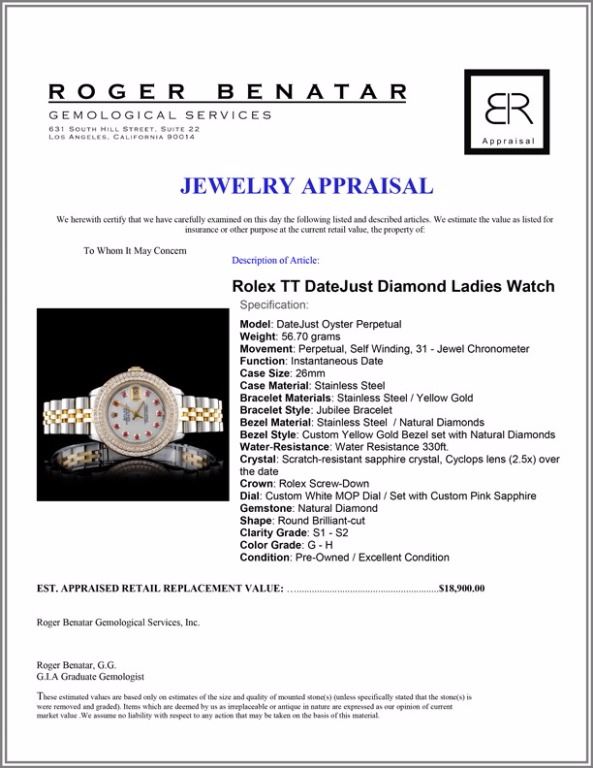 Dial: Custom White MOP Dial / Set with Custom Pink Sapphire