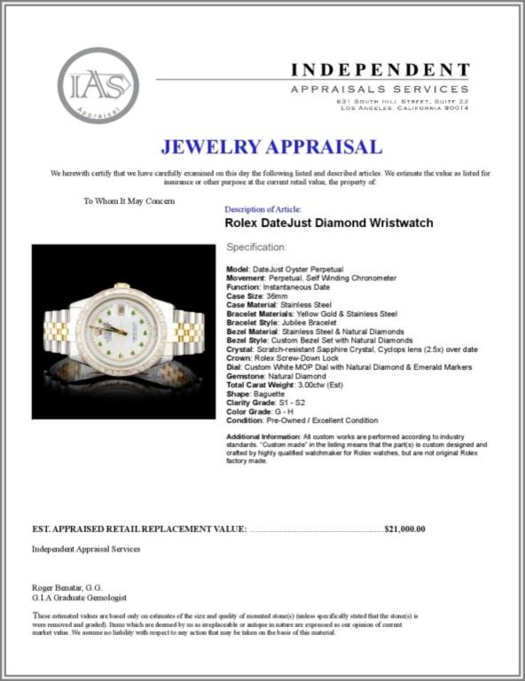 Dial: Custom White MOP Dial with Natural Diamond & Emerald Markers