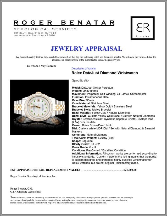 Dial: Custom White MOP Dial / Set with Natural Diamond & Emerald Markers