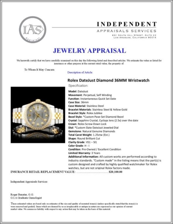 Regarding Appraised Jewelry and Loose Stones - Auctionfarm sends them out to a third party for Retail Replacement Value Appraisals, which are the most common. These types of evaluations are written for insurance needs. This would be the cost to replace the jewelry with an item of equal quality and kind, considered to be the current market price or the replacement value. This type of appraisal is done to protect you in the event of damage or loss of a valuable item. Our appraisals are conducted by independent 3rd Party appraisal firms that utilizes Certified GIA Gemologist. Appraisals should be used for verification of gemstone and/or metal weight, size, and grade only, not actual value. Appraisal value should be considered for insurance purposes only, not actual value, as price varies greatly from retail locations thru out the world. Items should not be purchased with the expectation to resell for appraisal price, or for profit.