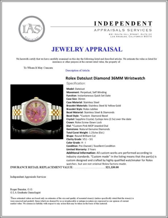 Regarding Appraised Jewelry and Loose Stones - Auctionfarm sends them out to a third party for Retail Replacement Value Appraisals, which are the most common. These types of evaluations are written for insurance needs. This would be the cost to replace the jewelry with an item of equal quality and kind, considered to be the current market price or the replacement value. This type of appraisal is done to protect you in the event of damage or loss of a valuable item. Our appraisals are conducted by independent 3rd Party appraisal firms that utilizes Certified GIA Gemologist. Appraisals should be used for verification of gemstone and/or metal weight, size, and grade only, not actual value. Appraisal value should be considered for insurance purposes only, not actual value, as price varies greatly from retail locations thru out the world. Items should not be purchased with the expectation to resell for appraisal price, or for profit.