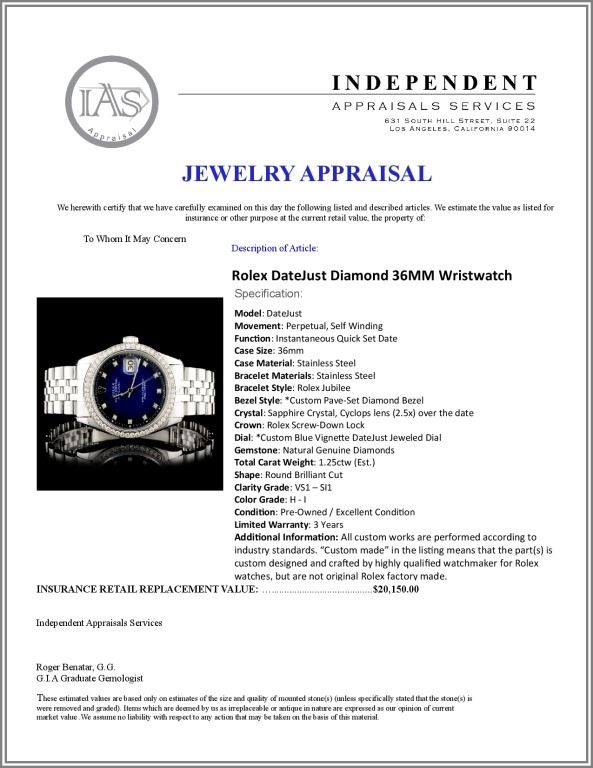 Regarding Appraised Jewelry and Loose Stones - Auctionfarm sends them out to a third party for Retail Replacement Value Appraisals, which are the most common. These types of evaluations are written for insurance needs. This would be the cost to replace the jewelry with an item of equal quality and kind, considered to be the current market price or the replacement value. This type of appraisal is done to protect you in the event of damage or loss of a valuable item. Our appraisals are conducted by independent 3rd Party appraisal firms that utilizes Certified GIA Gemologist. Appraisals should be used for verification of gemstone and/or metal weight, size, and grade only, not actual value. Appraisal value should be considered for insurance purposes only, not actual value, as price varies greatly from retail locations thru out the world. Items should not be purchased with the expectation to resell for appraisal price, or for profit.