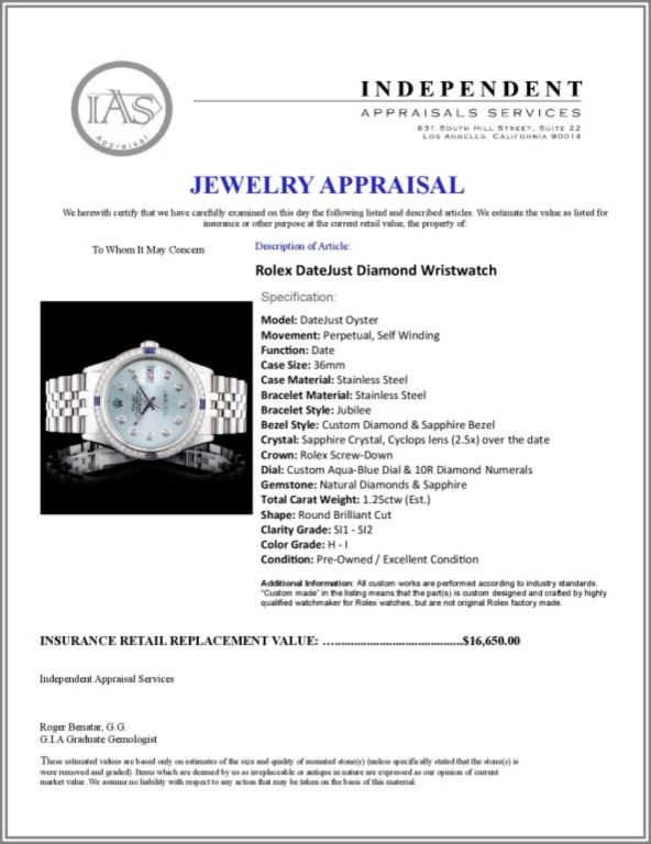 Dial: Custom Aqua-Blue Dial & 10R Diamond Numerals