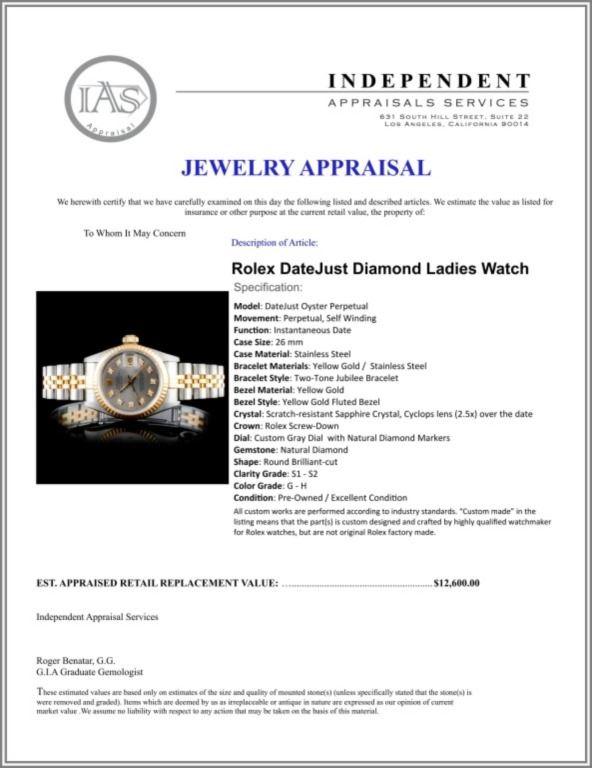 Regarding Appraised Jewelry and Loose Stones - Auctionfarm sends them out to a third party for Retail Replacement Value Appraisals, which are the most common. These types of evaluations are written for insurance needs. This would be the cost to replace the jewelry with an item of equal quality and kind, considered to be the current market price or the replacement value. This type of appraisal is done to protect you in the event of damage or loss of a valuable item. Our appraisals are conducted by independent 3rd Party appraisal firms that utilizes Certified GIA Gemologist. Appraisals should be used for verification of gemstone and/or metal weight, size, and grade only, not actual value. Appraisal value should be considered for insurance purposes only, not actual value, as price varies greatly from retail locations thru out the world. Items should not be purchased with the expectation to resell for appraisal price, or for profit.