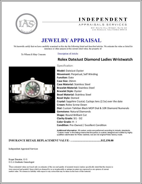 Dial: Custom Tahitian Black MOP Dial & 10R Diamond Numerals