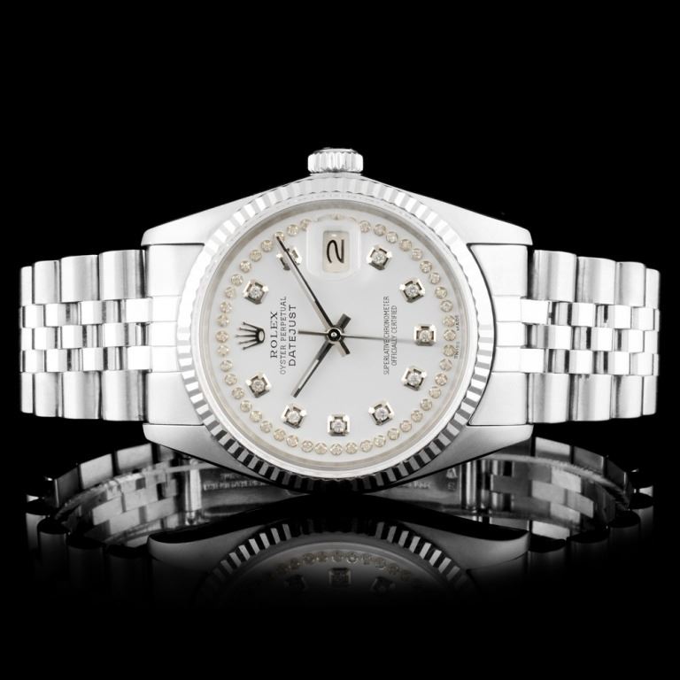 Estimated Retail Replacement Value: $11,790.00Ref: BAS14000Item No.: ARXAA-0014Specification:Documents: Appraisal ReportModel: DateJustMovement: Perpetual, Self WindingFunction: Instantaneous Quick Set DateCase Size: 36mmCase Material: Stainless Steel Bracelet Materials: Stainless Steel Bracelet Style: Rolex JubileeBezel Material: White GoldBezel Style: Rolex FlutedCrystal: Acrylic Crystal, Cyclops lens (2.5x) over the dateCrown: Rolex Screw-Down LockDial: Custom White Jeweled Dial Condition: Pre-Owned / Excellent Condition*Additional Information: All custom works are performed according to industry standards. ÒCustom madeÓ in the listing means that the part(s) is custom designed and crafted by highly qualified watchmaker for Rolex watches, but are not original Rolex factory made. Great Condition - Shipping notes: We ship 4-10 Business day after the clearance of payment. Tracking numbers are emailed once the package(s) are shipped. Most shipments are sent by FEDEX Priority, UPS Priority, or US PRIORITY MAIL INSURED
