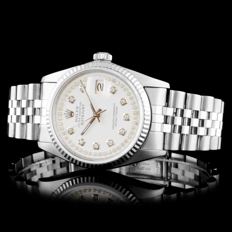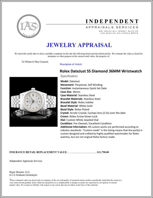 Estimated Retail Replacement Value: $11,790.00Ref: BAS14000Item No.: ARXAA-0014Specification:Documents: Appraisal ReportModel: DateJustMovement: Perpetual, Self WindingFunction: Instantaneous Quick Set DateCase Size: 36mmCase Material: Stainless Steel Bracelet Materials: Stainless Steel Bracelet Style: Rolex JubileeBezel Material: White GoldBezel Style: Rolex FlutedCrystal: Acrylic Crystal, Cyclops lens (2.5x) over the dateCrown: Rolex Screw-Down LockDial: Custom White Jeweled Dial Condition: Pre-Owned / Excellent Condition*Additional Information: All custom works are performed according to industry standards. ÒCustom madeÓ in the listing means that the part(s) is custom designed and crafted by highly qualified watchmaker for Rolex watches, but are not original Rolex factory made. Great Condition - Shipping notes: We ship 4-10 Business day after the clearance of payment. Tracking numbers are emailed once the package(s) are shipped. Most shipments are sent by FEDEX Priority, UPS Priority, or US PRIORITY MAIL INSURED