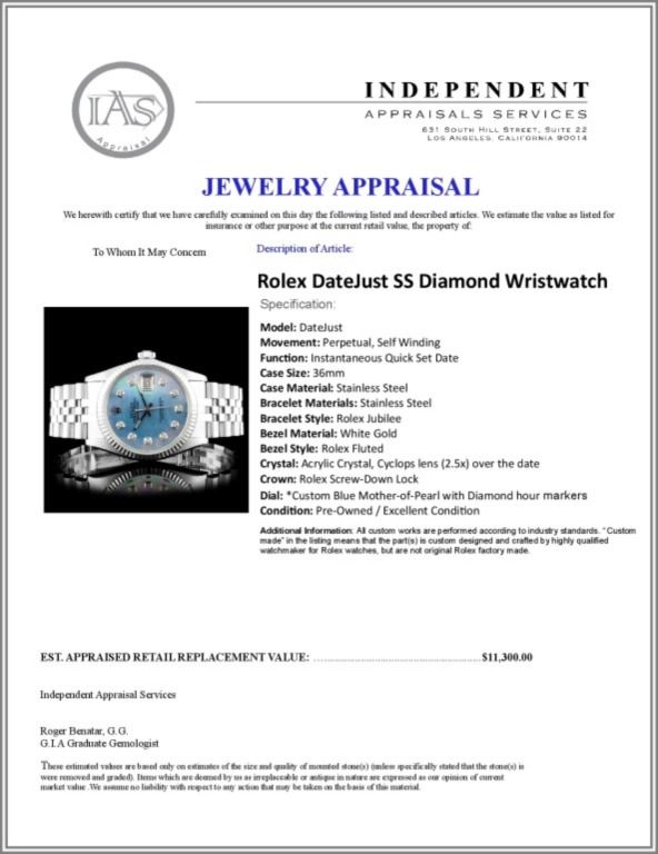 Dial: *Custom Blue Mother-of-Pearl with Diamond hour markers
