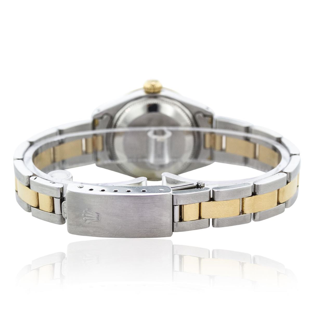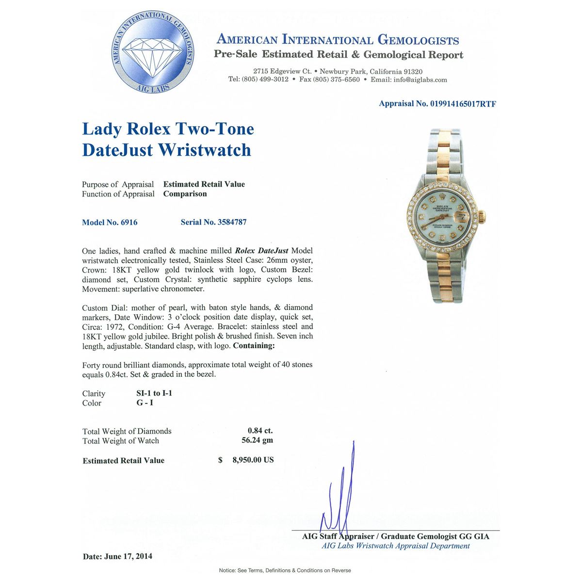 One ladies, hand crafted and machine milled Rolex DateJust Model wristwatch electronically tested, Stainless Steel Case: 26mm oyster, Crown: 18KT yellow gold twinlock with logo, Custom Bezel: diamond set, Custom Crystal: synthetic sapphire cyclops lens. Movement: superlative chronometer. Custom Dial: mother of pearl, with baton style hands, and diamond markers, Date Window: 3 o'clock position date display, quick set, Circa: 1972, Condition: G-4 Average. Bracelet: stainless steel and 18KT yellow gold jubilee. Bright polish and brushed finish. Seven inch length, adjustable. Standard clasp, with logo. Containing: Forty round brilliant diamonds, approximate. Total Weight of 40 stones equals 0.84ct. Set and graded in the bezel. Clarity: SI-1 to I-1. Color: G - I. Total Weight of Diamonds 0.84ct. Total Weight of Watch 56.24 grams. AIG Appraised at $8,950.00.