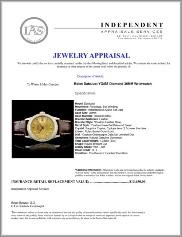 Regarding Appraised Jewelry and Loose Stones - Auctionfarm sends them out to a third party for Retail Replacement Value Appraisals, which are the most common. These types of evaluations are written for insurance needs. This would be the cost to replace the jewelry with an item of equal quality and kind, considered to be the current market price or the replacement value. This type of appraisal is done to protect you in the event of damage or loss of a valuable item. Our appraisals are conducted by independent 3rd Party appraisal firms that utilizes Certified GIA Gemologist. Appraisals should be used for verification of gemstone and/or metal weight, size, and grade only, not actual value. Appraisal value should be considered for insurance purposes only, not actual value, as price varies greatly from retail locations thru out the world. Items should not be purchased with the expectation to resell for appraisal price, or for profit.