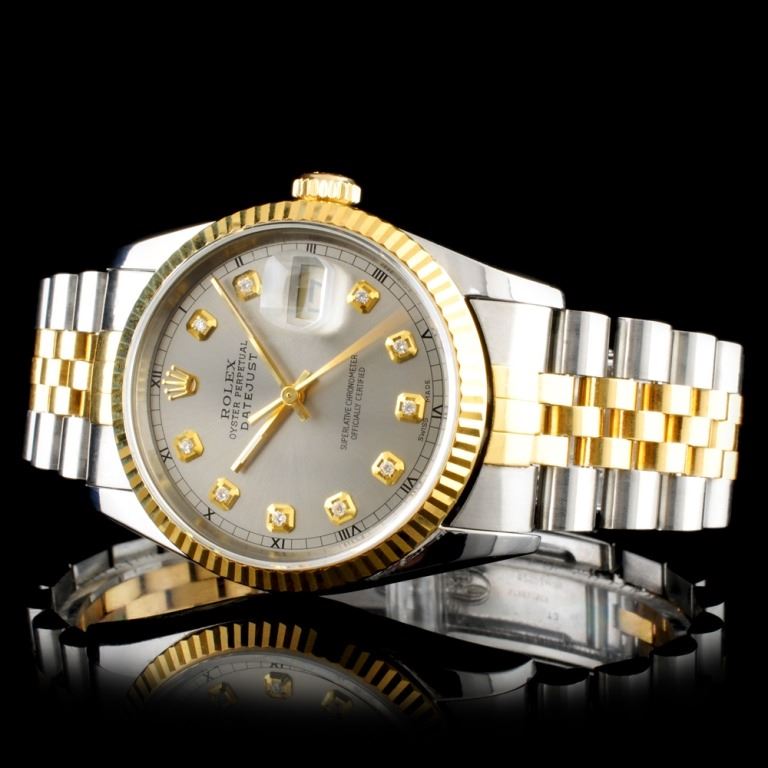 Estimated Retail Replacement Value: $12,750.00Ref: BAS15000Item No.: ARXAA-0004Specification:Documents: Appraisal ReportModel: DateJustMovement: Perpetual, Self WindingFunction: Instantaneous Quick Set DateCase Size: 36mmCase Material: Stainless Steel Bracelet Materials: Stainless Steel & Yellow GoldBracelet Style: Rolex JubileeBezel Material: Yellow GoldBezel Style: Rolex FlutedCrystal: Acrylic Crystal, Cyclops lens (2.5x) over the dateCrown: Rolex Screw-Down LockDial: Custom Slate Jeweled Dial Condition: Pre-Owned / Excellent Condition*Additional Information: All custom works are performed according to industry standards. ÒCustom madeÓ in the listing means that the part(s) is custom designed and crafted by highly qualified watchmaker for Rolex watches, but are not original Rolex factory made. Great Condition - Shipping notes: We ship 4-10 Business day after the clearance of payment. Tracking numbers are emailed once the package(s) are shipped. Most shipments are sent by FEDEX Priority, UPS Priority, or US PRIORITY MAIL INSURED