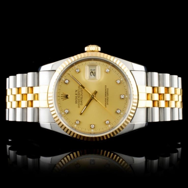 Estimated Retail Replacement Value: $14,995.00Ref: WAG15000Item No.: ARXAA-0026Specification:Documents: Appraisal ReportModel: DateJustMovement: Perpetual, Self WindingFunction: Instantaneous Quick Set DateCase Size: 36mmCase Material: Stainless Steel Bracelet Materials: Stainless Steel & Yellow Gold Bracelet Style: Rolex JubileeBezel Material: Yellow GoldBezel Style: Rolex FlutedCrystal: Acrylic Crystal, Cyclops lens (2.5x) over the dateCrown: Rolex Screw-Down Lock*Dial: Custom Champagne Jeweled Dial Condition: Pre-Owned / Excellent Condition*Additional Information: All custom works are performed according to industry standards. ÒCustom madeÓ in the listing means that the part(s) is custom designed and crafted by highly qualified watchmaker for Rolex watches, but are not original Rolex factory made. Great Condition - Shipping notes: We ship 4-10 Business day after the clearance of payment. Tracking numbers are emailed once the package(s) are shipped. Most shipments are sent by FEDEX Priority, UPS Priority, or US PRIORITY MAIL INSURED