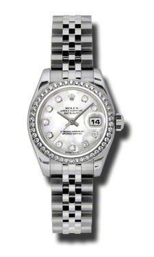 Model: 179384-MOPDJ - CASE = [Material:Stainless Steel], [Case Diameter:26], [Bezel:18kt White Gold Bezel Set with Diamonds], [Case Back:Solid], [Water Resistant:100 Meters - 330 Feet], [Crystal:Scratch Resistant Sapphire],; DIAL = [Color:Mother of Pearl Diamond],; MOVEMENT = [Type:Automatic Self Winding], [Crown:Screw Down],; BAND = [Clasp:Concealed Crown], [Type:Stainless steel Jubilee], (Usually ships in 1 to 2 weeks.)