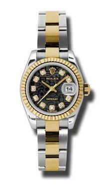Model: 179173-BKJDO - CASE = [Material:Stainless Steel], [Case Diameter:26], [Bezel:Fluted], [Case Back:Solid], [Water Resistant:100 Meters - 330 Feet], [Crystal:Sapphire],; DIAL = [Color:Black Jubilee Diamond],; MOVEMENT = [Type:Automatic Self Winding], [Crown:Screw Down],; BAND = [Clasp:Oysterlock Clasp], [Type:18kt Yellow Gold and Stainless Steel], (Usually ships in 1 to 2 weeks.)