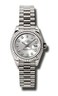 Model: 179179-SIDJ - CASE = [Material:18kt White Gold], [Case Diameter:26], [Bezel:Fluted], [Case Back:Solid], [Water Resistant:100 Meters - 330 Feet], [Crystal:Sapphire],; DIAL = [Color:Silver Diamond],; MOVEMENT = [Type:Automatic Self Winding], [Crown:Screw Down],; BAND = [Clasp:Concealed Crown], [Type:18kt White Gold Jubilee], (Usually ships in 1 to 2 weeks.)