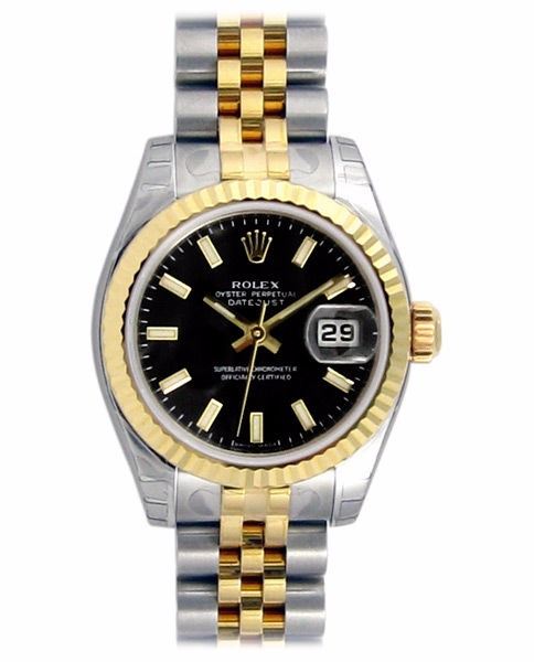 Model: 179173-BKSJ - CASE = [Material:Stainless Steel], [Case Diameter:26], [Bezel:Fixed Fluted], [Water Resistant:100 Meters - 330 Feet], [Crystal:Scratch Resistant Sapphire],; DIAL = [Color:Black Luminous Stick],; MOVEMENT = [Type:31 Jewels Automatic Self Winding],; BAND = [Clasp:Hidden Deployant], [Type:18kt Yellow Gold and Stainless Steel Jubilee], (Usually ships in 1 to 2 weeks.)