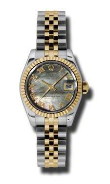 Model: 179173-BKMOPRJ - CASE = [Material:Stainless Steel], [Case Diameter:26], [Bezel:Fixed Fluted 18kt Yellow Gold], [Case Back:Solid], [Water Resistant:100 Meters - 330 Feet], [Crystal:Scratch Resistant Sapphire],; DIAL = [Color:Dark Mother of Pearl Roman Numeral],; MOVEMENT = [Type:Automatic Self Winding], [Crown:Screw Down],; BAND = [Clasp:Concealed Crown], [Type:18kt Yellow Gold and Stainless Steel Jubilee], (Usually ships in 1 to 2 weeks.)