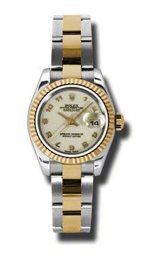 Model: 179173-IVAO - CASE = [Material:Stainless Steel], [Case Diameter:26], [Bezel:Fluted], [Case Back:Solid], [Water Resistant:100 Meters - 330 Feet], [Crystal:Sapphire],; DIAL = [Color:Ivory Arabic],; MOVEMENT = [Type:Automatic Self Winding], [Crown:Screw Down],; BAND = [Clasp:Oysterlock Clasp], [Type:18kt Yellow Gold and Stainless Steel], (Usually ships in 1 to 2 weeks.)