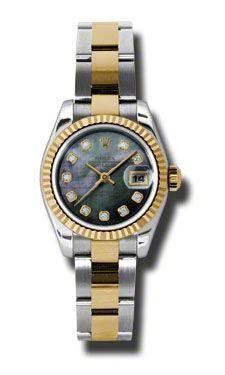 Model: 179173-BKMOPDO - CASE = [Material:Stainless Steel], [Case Diameter:26], [Bezel:Fluted], [Case Back:Solid], [Water Resistant:100 Meters - 330 Feet], [Crystal:Sapphire],; DIAL = [Color:Black Mother of Pearl Diamond],; MOVEMENT = [Type:Automatic Self Winding], [Crown:Screw Down],; BAND = [Clasp:Oysterlock Clasp], [Type:18kt Yellow Gold and Stainless Steel], (Usually ships in 1 to 2 weeks.)