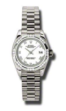 Model: 179369-WHRP - CASE = [Material:18kt White Gold], [Case Diameter:26], [Bezel:Set With 24 Diamonds], [Water Resistant:100 Meters - 330 Feet], [Crystal:Sapphire], DIAL = [Color:White Roman Numeral], MOVEMENT = [Type:Automatic Self Winding], [Crown:Screw Down], BAND = [Clasp:Concealed Crown], [Type:18kt White Gold], (Usually ships in 1 to 2 weeks.)