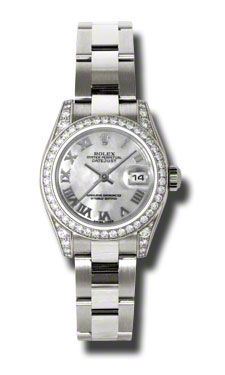 Model: 179159-MOPRO - CASE = [Material:18kt White Gold With Diamonds], [Case Diameter:26], [Bezel:Diamonds and 18k White Gold], [Case Back:Solid], [Water Resistant:100 Meters - 330 Feet], [Crystal:Sapphire], DIAL = [Color:Mother of Pearl Roman Numeral], MOVEMENT = [Type:Automatic Self Winding], [Crown:Screw Down], BAND = [Clasp:Oysterlock Clasp], [Type:18kt White Gold Oyster], (Usually ships in 1 to 2 weeks.)