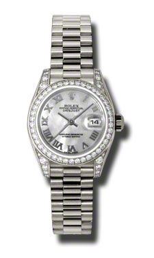 Model: 179159-MOPRPR - CASE = [Material:18k White Gold Diamond], [Case Diameter:26], [Bezel:18k White Gold Diamond], [Case Back:Solid], [Water Resistant:100 Meters - 330 Feet], [Crystal:Sapphire], DIAL = [Color:Mother of Pearl Roman Numeral], MOVEMENT = [Type:Automatic Self Winding], [Crown:Screw Down], BAND = [Clasp:Concealed Crown], [Type:18k White Gold President], (Usually ships in 1 to 2 weeks.)
